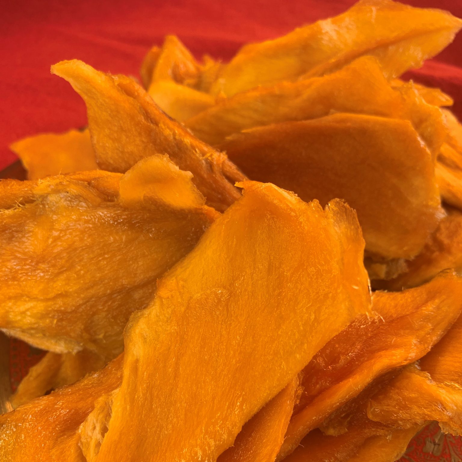 Getrocknete Mango Scheiben, die durch das aufkochen im eigenen Saft besonders süß, fruchtig und saftig schmecken. Ohne zugesetzten Zucker und vegan.