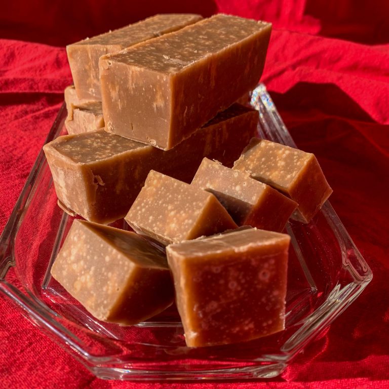 Dieses rein pflanzliche Fudge auf Sojamilch Basis hat einen kräftigen Karamellgeschmack und ist mit Salzkristallen aromatisiert, die man sogar noch sehen kann und auch einen spannenden Einfluss auf die Konsistenz haben.
